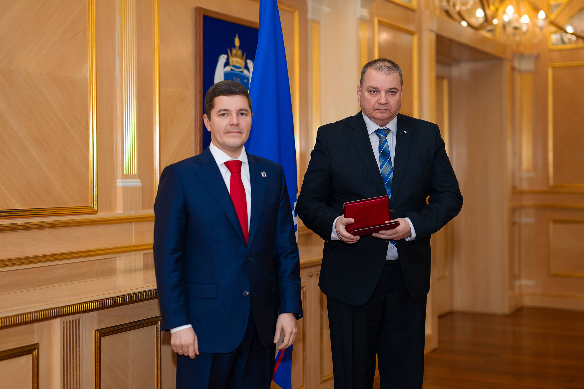 Назад к новостям10 декабря, в день 95-летия округа, губернатор ЯНАО Дмитрий Артюхов вручил награды выдающимся ямальцам, внесшим особый вклад в развитие региона. Торжественная церемония состоялась в окружной столице. Открывая мероприятие Дмитрий Артюхов поздравил присутствующих с праздником. Он отметил, что Ямал остаётся одним из центров энергетического потенциала страны, территорией стабильности и динамичного развития, и в этом заслуга тех, кто упорным трудом обеспечивает его мощь и славу. Почётные награды получили 29 жителей, достойно трудящихся на благо региона.