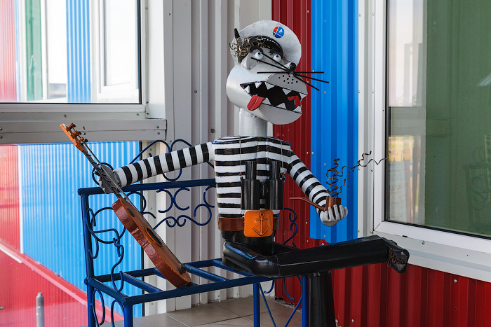 Север — суров :) В вахтовом городке нас встречает доброжелательный волк, которого умельцы из механо-ремонтной службы промысла смастерили из отработавших свой век запчастей и металлолома.