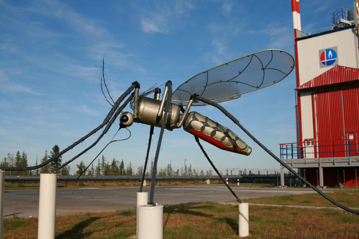 После расселения нас знакомят с техникой безопасности и предупреждают, что комаров будет много (советуют соответствующе одеваться). Но когда в номере гостиницы мы увидели количество приготовленного репеллента (специального антикомариного средства), то поняли, что поездка будет очень интересной и незабываемой. На фото — памятник комару от все той же механо-ремонтной службы.