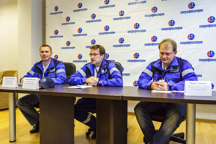 Предваряя посещение производственных объектов, руководство «Севернефтегазпрома» рассказывает нам о компании и месторождении. В центре — Станислав Цыганков (генеральный директор), справа — Борис Санников (заместитель генерального директора по кадрам и социальному развитию), слева — Андрей Касьяненко (заместитель главного инженера).