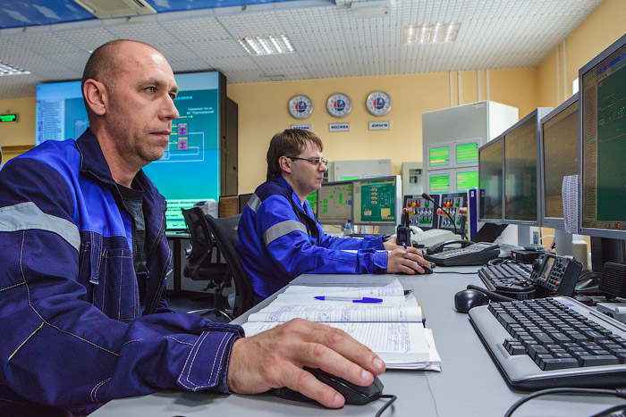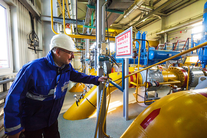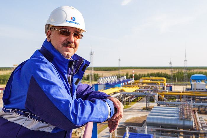 Промысел Южно-Русского месторождения — один из самых современно оснащенных в России. Сотрудники контролируют технологический процесс, не выходя из помещения главного щита управления. Всего на месторождении в одну вахту работают 250 человек. Оперативный персонал круглосуточно контролирует технологический режим и корректирует параметры работы оборудования. Остальные работники обслуживают газовые скважины, системы водоснабжения и канализации, обеспечивают транспортные перевозки, содержание внутрипромысловых дорог, ремонт и ревизию технологического оборудования, исследование скважин. Сама вахта длится месяц. После месяца напряженного труда работники выезжают к месту постоянного жительства, а на их место прибывает следующая вахта. На фото: на дальнем плане — начальник смены Сергей Савенков, на переднем плане — оператор по добыче газа 6 разряда Анатолий Новопашин.