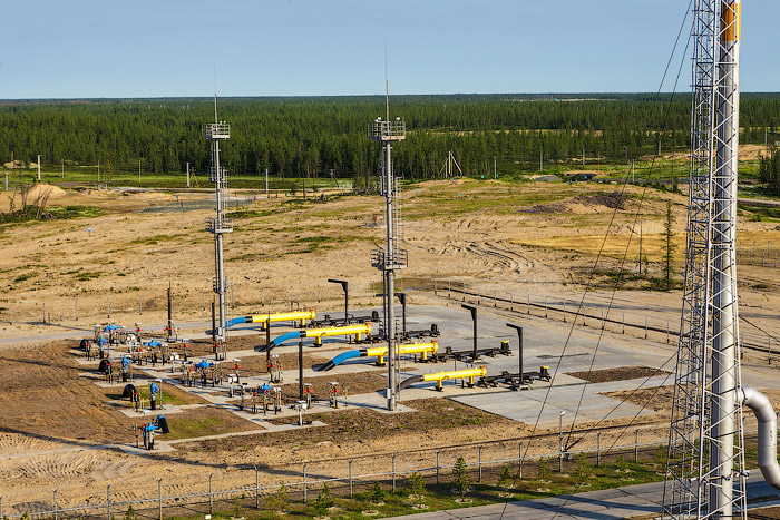 Приближаемся к месторождению — в одну точку сходятся нитки трубопроводов. Это газосборная сеть месторождения, по которой газ идет от скважин до установки комплексной подготовки газа (УКПГ). На УКПГ газ очищается, осушается и отправляется в Единую систему газоснабжения России.