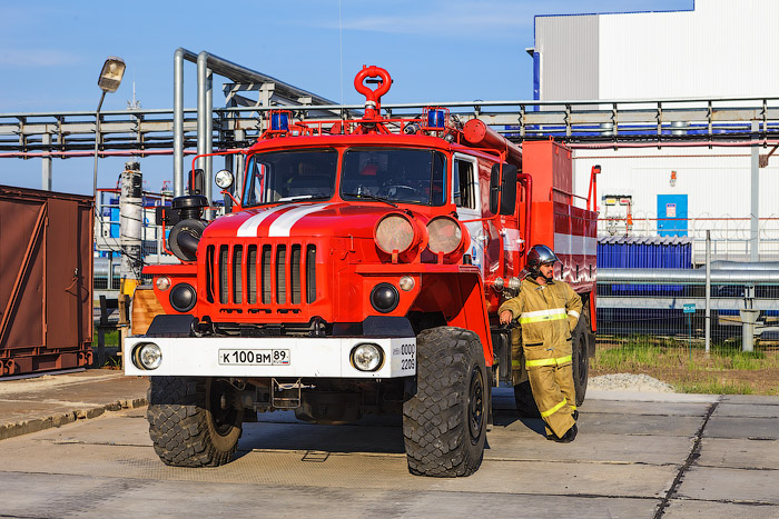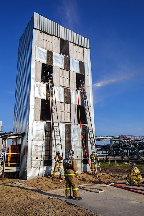 На территории промысла есть своя пожарная часть, бойцы которой провели для нас небольшую показательную тренировку.