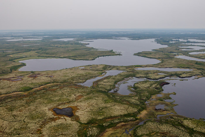 Снова пролетаем над бескрайней тундрой. Дорог здесь нет, или они действуют только зимой — это так называемые зимники.