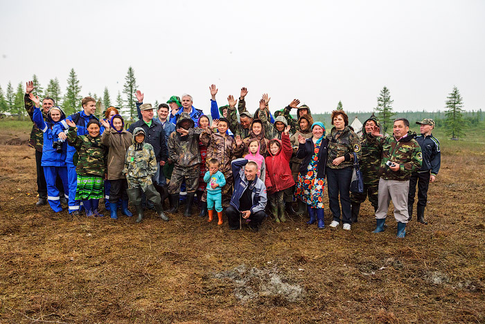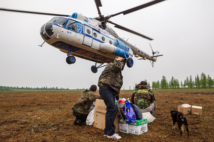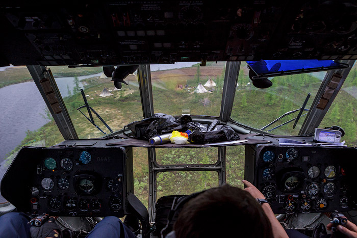 Далее — снова в вертолет. Теперь летим к стойбищу оленеводов. Признак мастерства экипажа — подобрать площадку с воздуха и сесть на нее. Дело в том, что тундра здесь как большое мягкое болото. По нему можно ходить, но поверхность пружинит. После легкого касания земли бортмеханик пулей выскакивает из кабины и смотрит, как шасси придавливает поверхность. Если что-то выглядит подозрительно, он дает знак и КВС отрывает машину. К слову сказать, в паре метров от места посадки один из нас чуть позже провалился в воду.