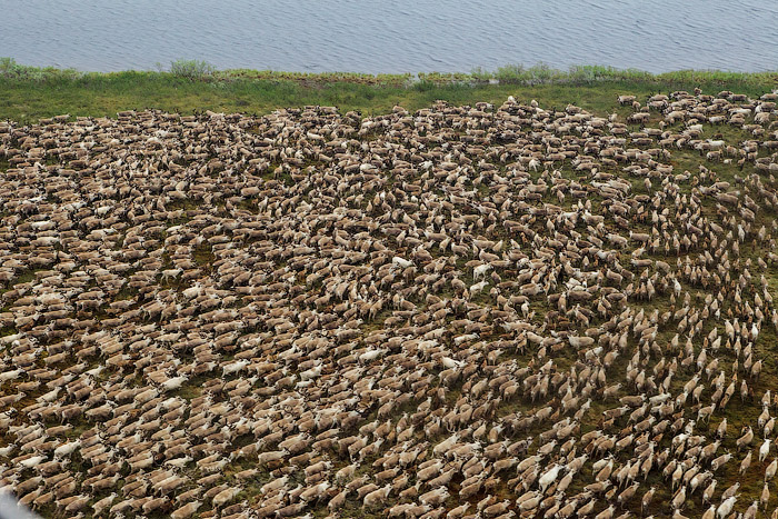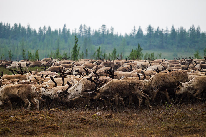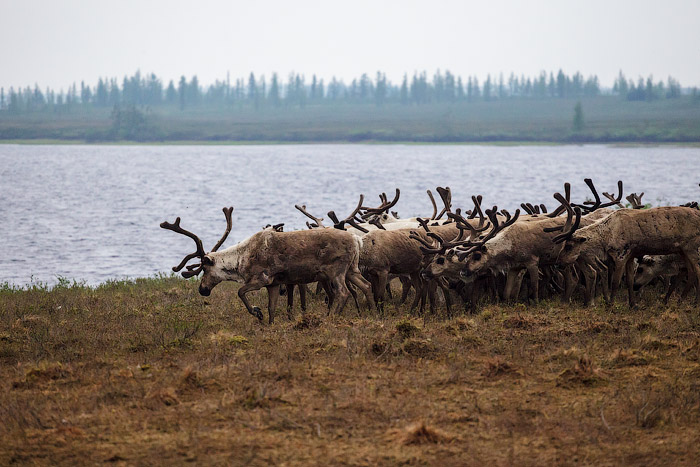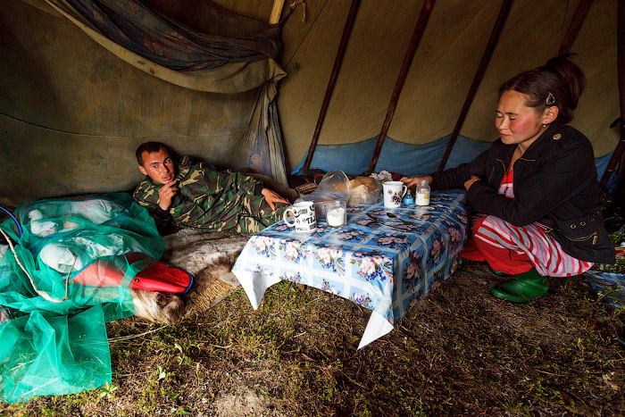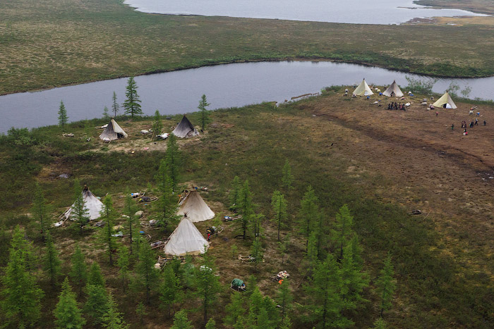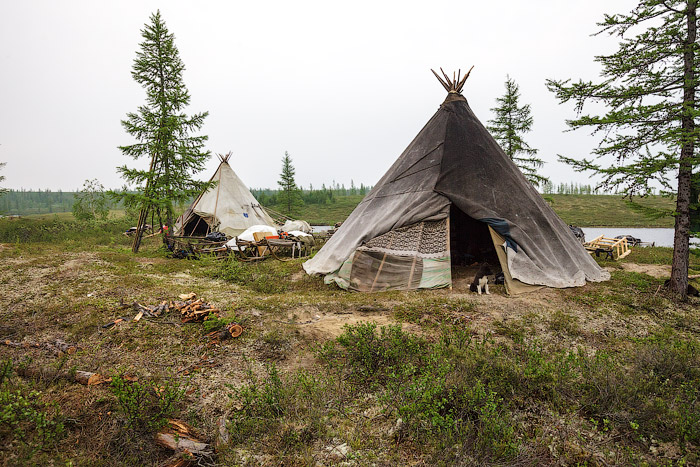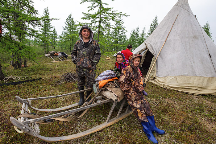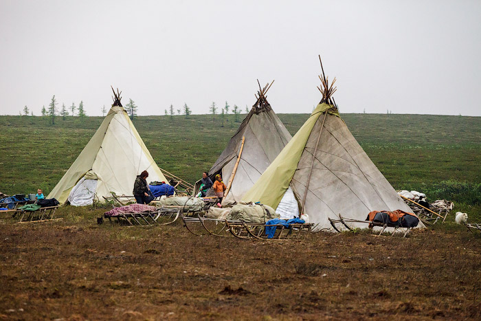 В этом месте живут несколько семей, которые смотрят за стадом. Летом они кочуют раз в два-три дня, а зимой могут оставаться на месте до недели. Дело в том, что олени едят ягель, который очень медленно растет (по 3–5 мм в год). И во избежание истощения пастбищ стада нужно постоянно перегонять на новые места.